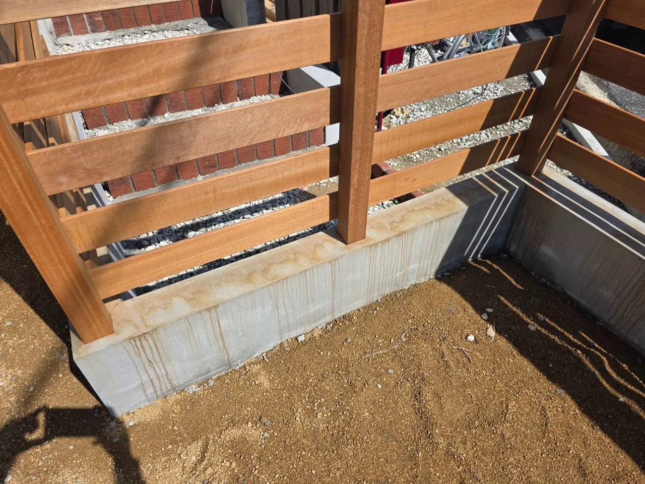 天然木のウッドフェンスでは、雨の後に樹液が染み出し、コンクリートや壁に茶色いシミができるトラブルがよくあります。特にウリンやセランガンバツなどのハードウッドは樹液の色が濃く、設置後約2か月間は染み出しが続くことがあります。